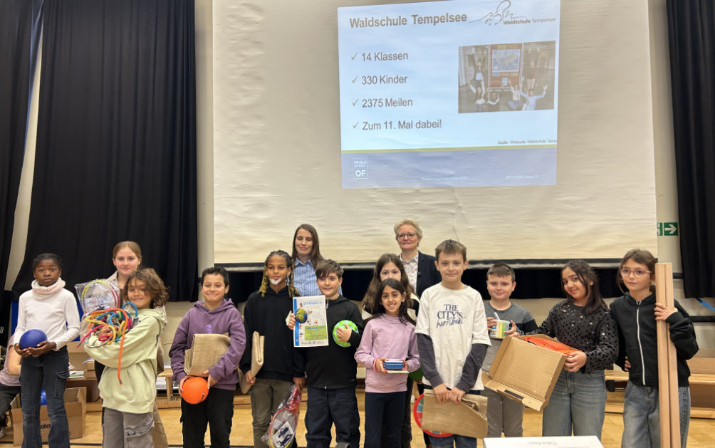 Zum Abschluss der Aktion wurde die Schülervertretung (SV) zur feierlichen Prämierung eingeladen. Dort wurden die Kinder für ihre 2.375 gemeinsam gesammelten Meilen von Bürgermeisterin und Klimadezernentin Sabine Groß sowie der Leiterin des Amtes für Umwelt und Klima, Wiebke Fiebig, mit tollen Pausenhofspielen und einer Urkunde ausgezeichnet.