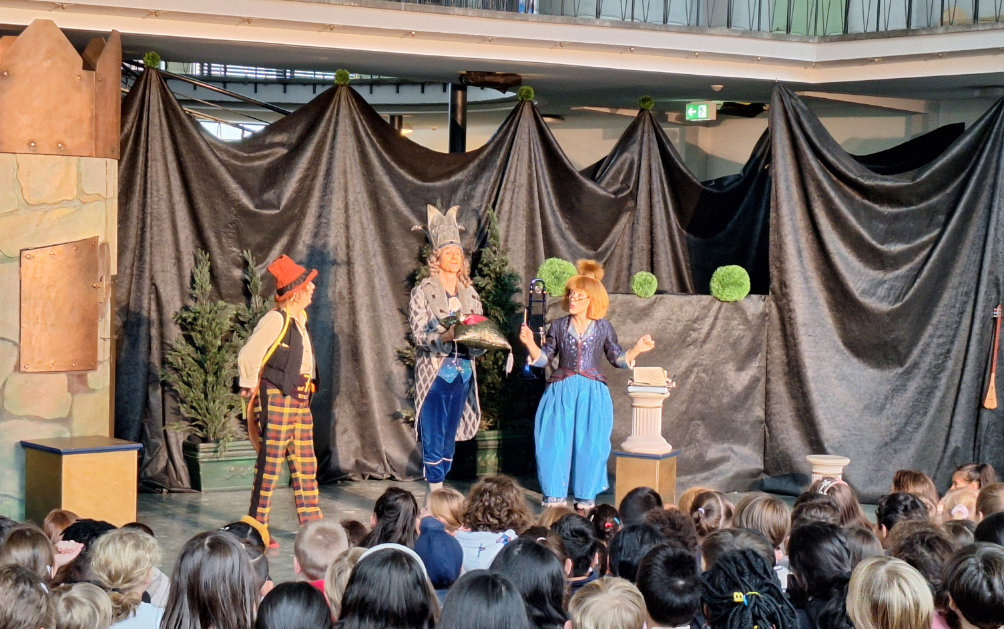 Das Theaterensemble mimikri war zu Gast in der Waldschule mit dem Stück „Das tapfere Schneiderlein“. Vor einem liebevoll gestalteten Bühnenbild wurden die Märchenfiguren zum Leben erweckt.