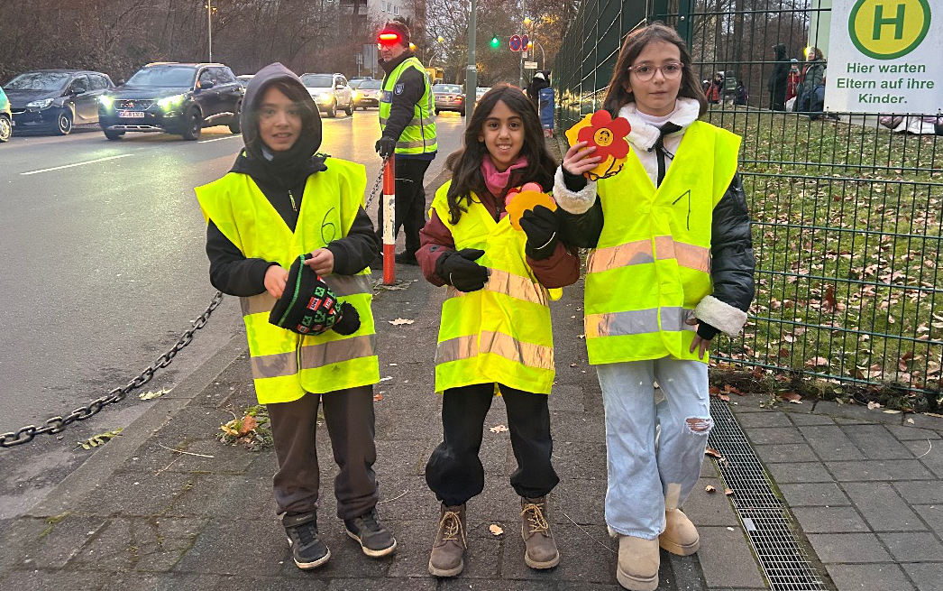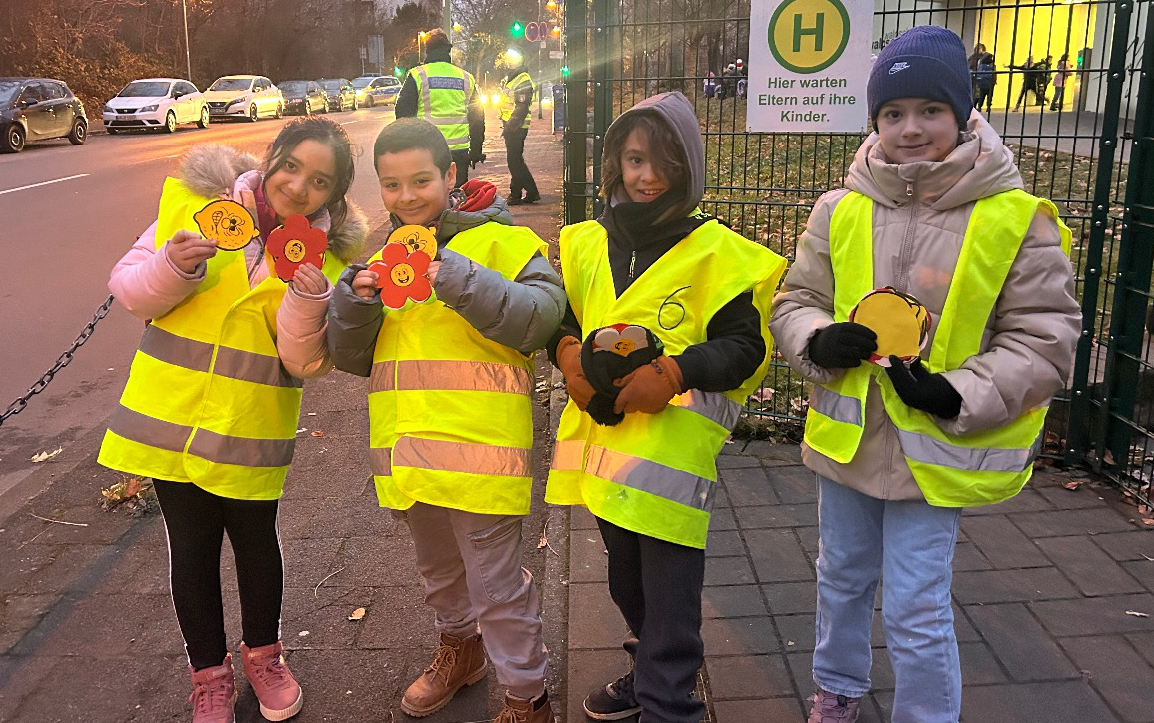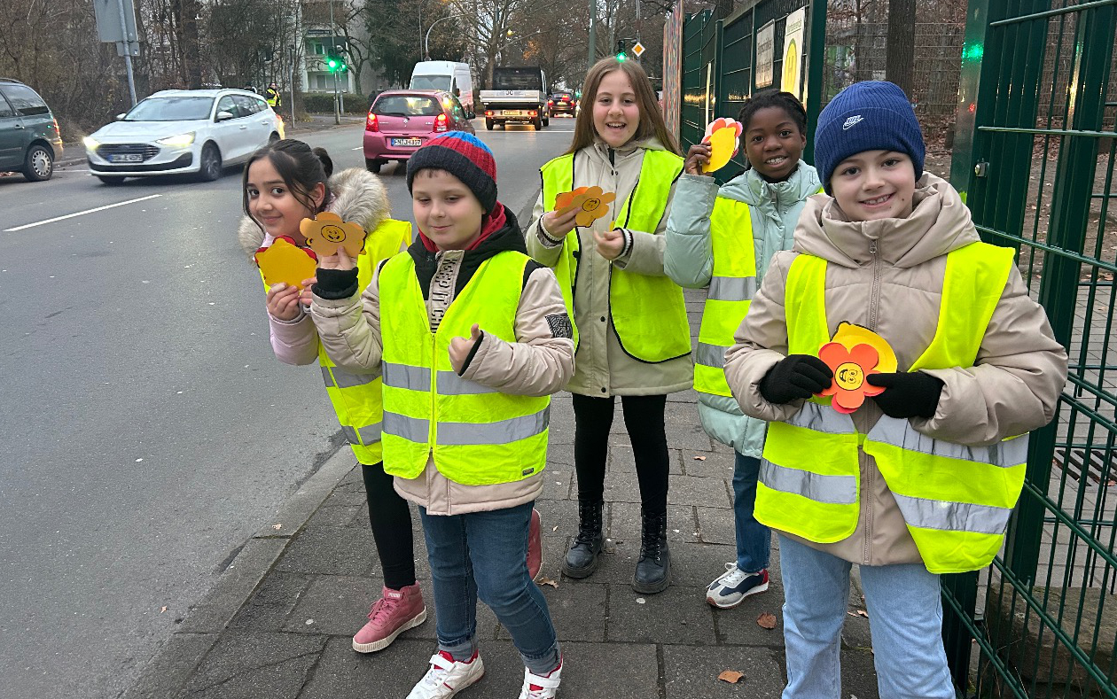 Von 7:30 bis 8:00 Uhr beobachteten die Klassensprecherinnen und Klassensprecher der vierten Klassen gemeinsam mit den städtischen Beamten die Verkehrssituation. Dabei wurden die Eltern, die sich rücksichtsvoll verhielten, mit einer Blume belohnt. Eltern hingegen, die im Halteverbot hielten oder das Schulgelände betraten, bekamen eine saure Zitrone als Hinweis auf ihr Fehlverhalten.
